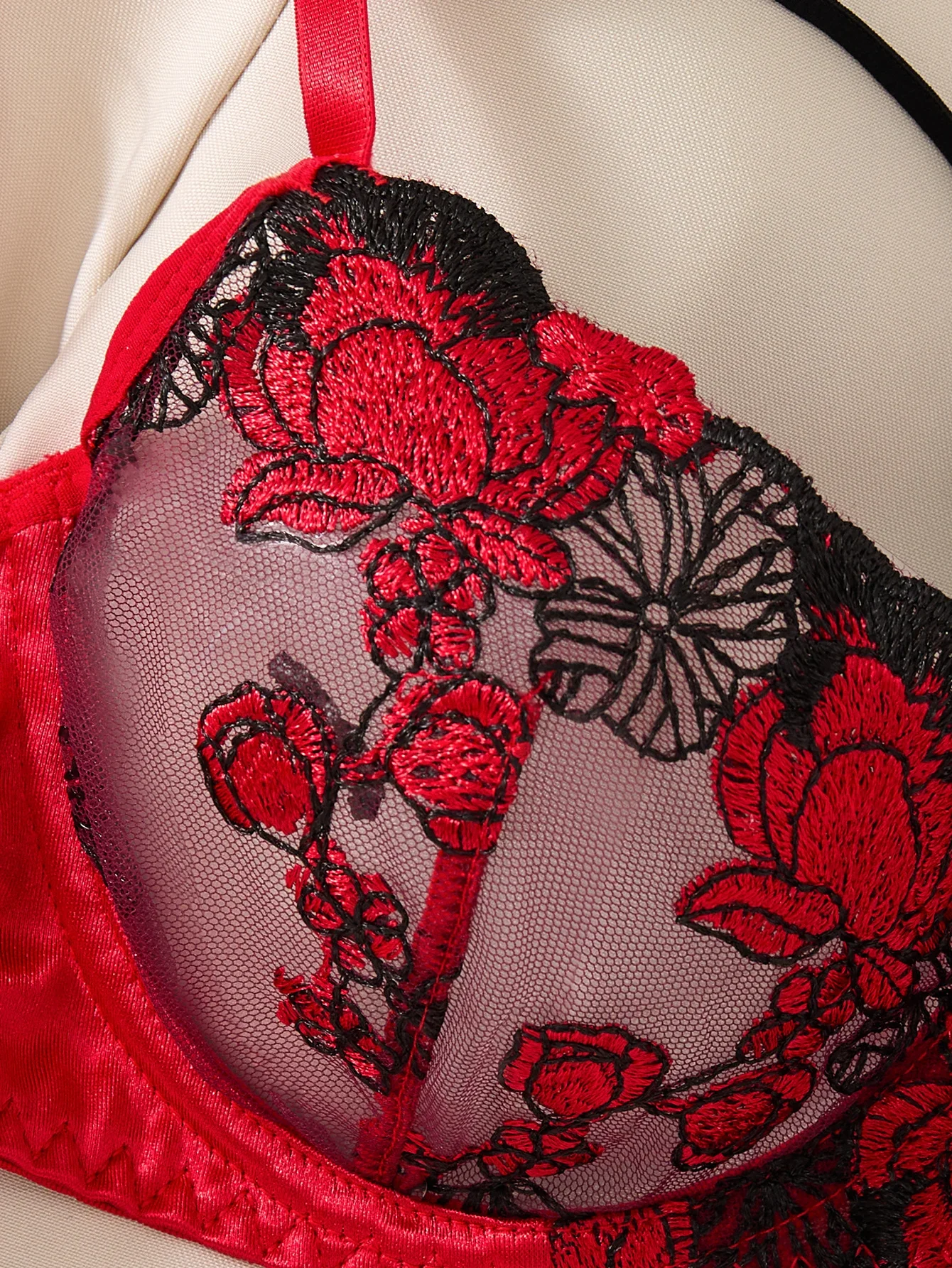 The intricate floral embroidery adds a touch of elegance and femininity to this lingerie set.